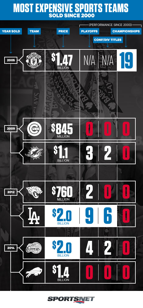 Money can’t buy everything. Case in point: The ten most expensive sports teams sold since 2000. Money certainly bought them—to the tune of billions of dollars. But did it buy a winner? Not really. Of the 10, only one—Manchester United—has won a league title since 2000. And they’ve actually been getting worse. Some of these teams may be vast investments in championship potential (the Clippers) but some feel like massive money pits (the Bills) or even hugely expensive curses (the Cubs).