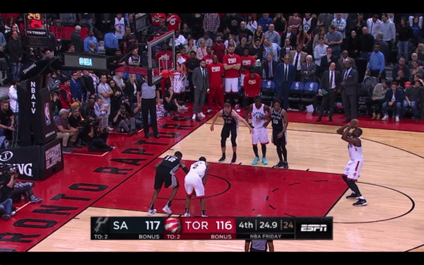 Fifty days later, with the scene shifting to Toronto, the story changed in a big way as Leonard managed to get his revenge against his former club, highlighted by this steal against DeRozan, beginning from some full-court pressure and breakaway dunk that put the Raptors up for good with 15 seconds left to play.
