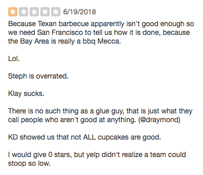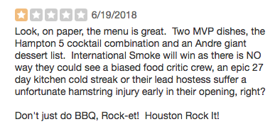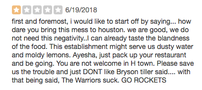 On Tuesday, the Houston location of International Smoke’s Yelp page got flooded with a flurry of negative one-star reviews from Rockets fans who are still very salty over seeing their team lose to the Dubs in the post-season for the third time in four years.