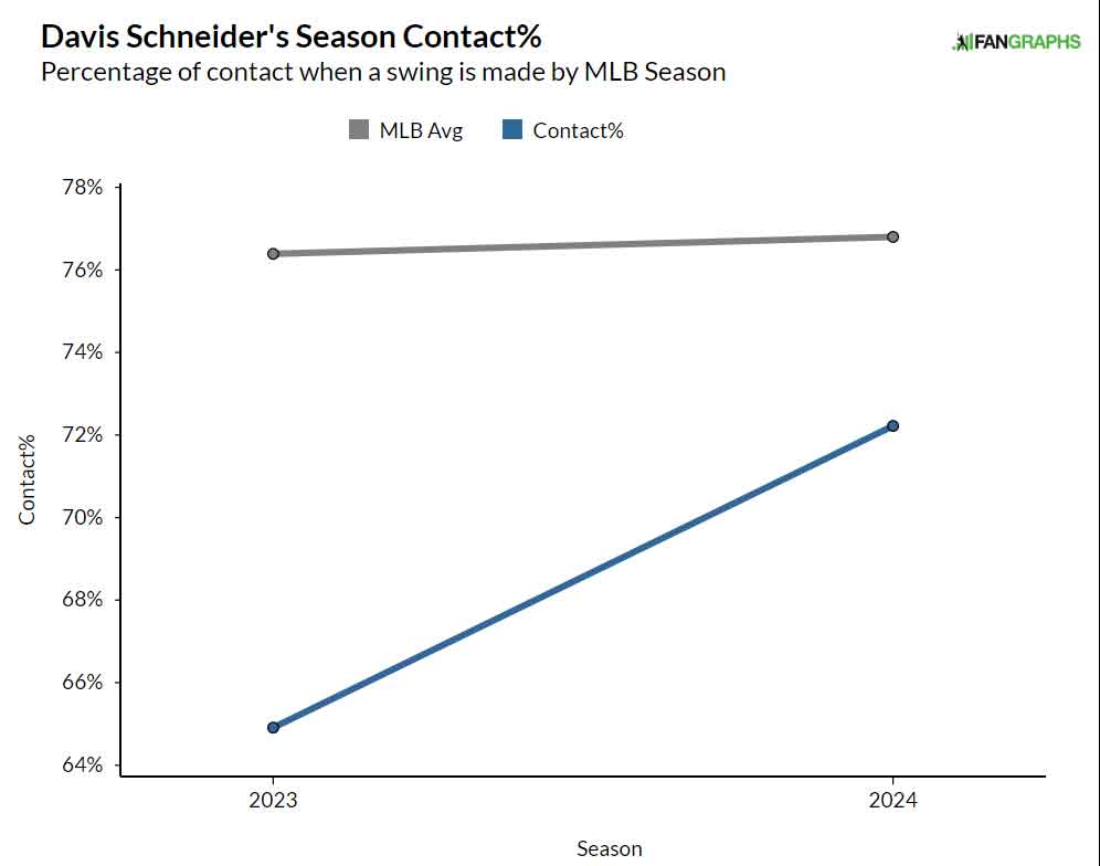A lot of the difference here is not about how Schneider is hitting the ball — although it’s worth noting his average exit velocity is 1.5 mph harder than last year — but how often he’s making contact.