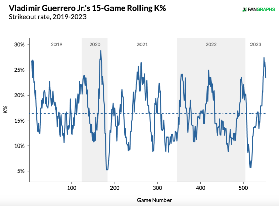 In fact, Vladdy is striking out a rate the team hasn’t seen since 2020: