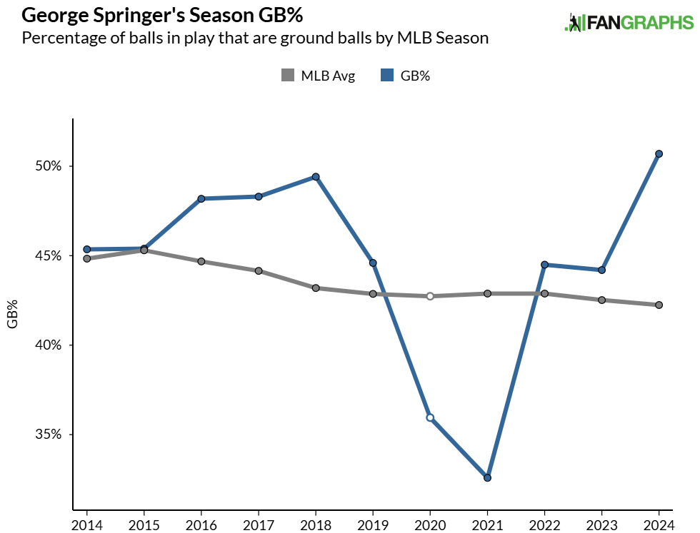 Hoping a 35-year-old player will have his best year since he was 32 after a couple of decline seasons is a big ask. Springer’s 2024 included a respectable xwOBA (.322), but he also had the worst max exit velocity of his career by three mph (110.6), suggesting his top-end power has deserted him. He also saw his groundball rate spike to career-high levels: