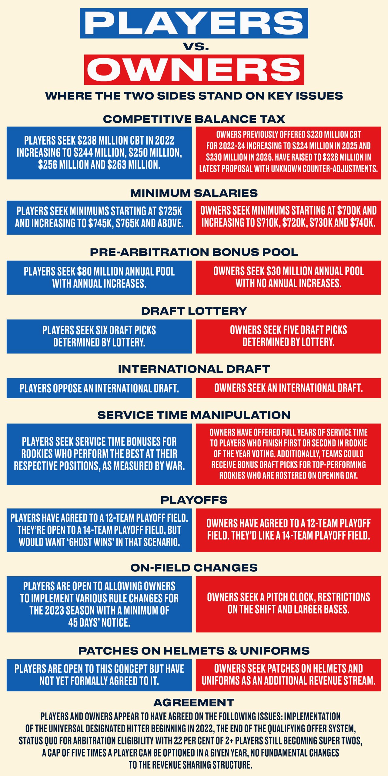 Hypothetically, if MLB offered to increase the MLB minimum salary to $1 million, that could be a concession worth upwards of $100 million annually to the players. That in itself would be a massive game-changer. If the owners were willing to do that while also agreeing to the players’ proposed figures for the pre-arbitration bonus pools, you might have a path to a deal without increasing the CBT much beyond $220 million.