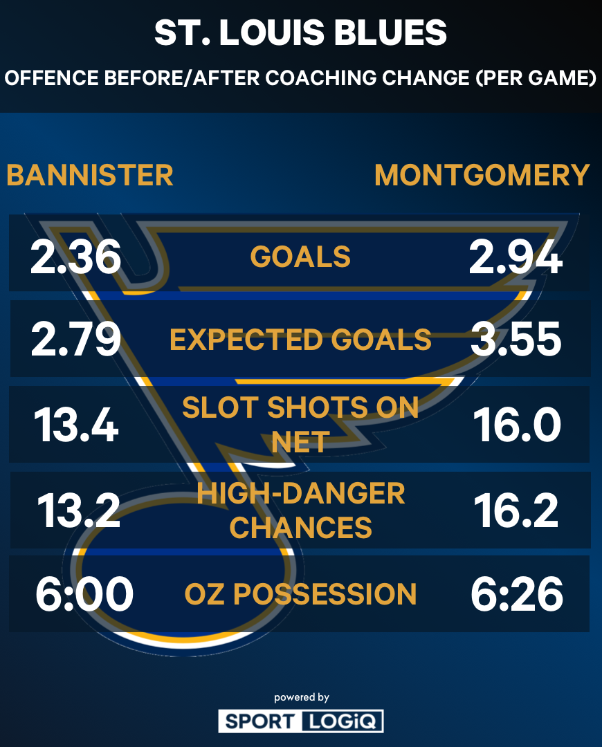 St. Louis had the 30th-ranked offence under Bannister, scoring two or fewer goals in 13 of its first 22 games, including one goal in seven of those games. Progress has been made since Montgomery took over the team. Shot quality is up considerably over the past 16 games. The Blues have been fourth in the NHL in expected goals per game since Nov. 25. (They were 28th through Nov. 23.)
