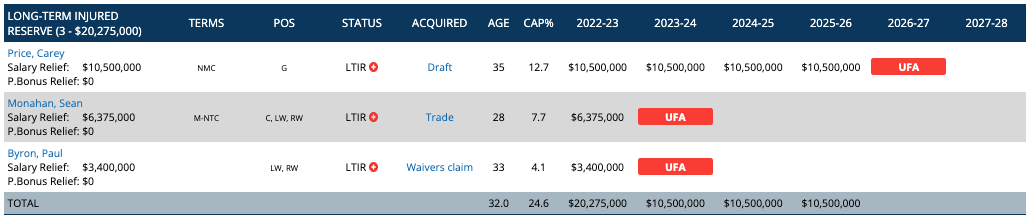 Notes: Carey Price has a full no-move clause; Sean Monahan has a 10-team no-trade clause.