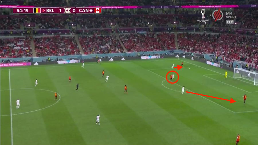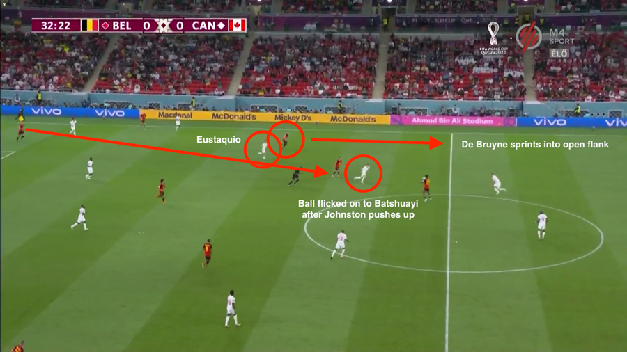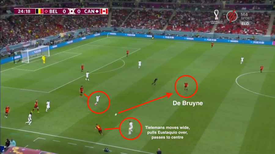 But when Eustaquio and Hutchinson weren't present in the middle, trouble began to brew. Due to the man-marking from Canada, Belgium began to move closer to the touchline, dragging the Canadian midfielders with them and this opened up space centrally for De Bruyne to turn and counter.