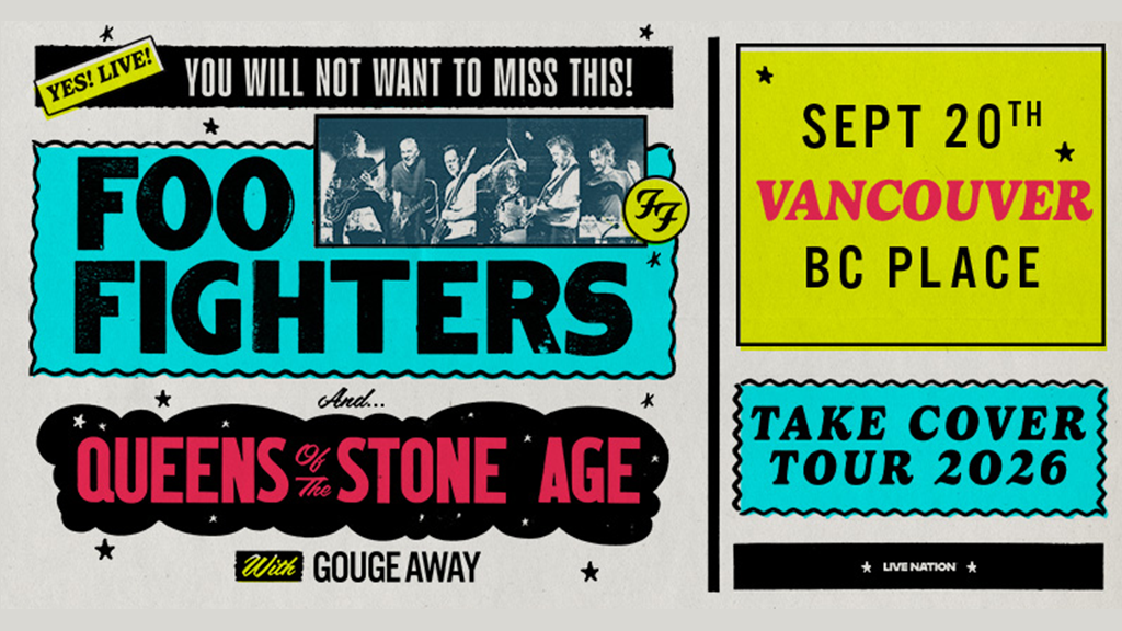 Foo Fighters are ready to ROCK BC Place on September 20th, 2026 with the Take Cover Tour 2026 with Queens of the Stone Age and Gouge Away!