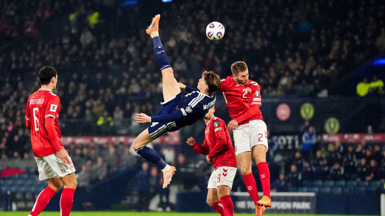 Scott McTominay scored a superb bicycle kick goal three minutes into Scotland’s match against Denmark in European qualifying for the 2026 World Cup on Tuesday.