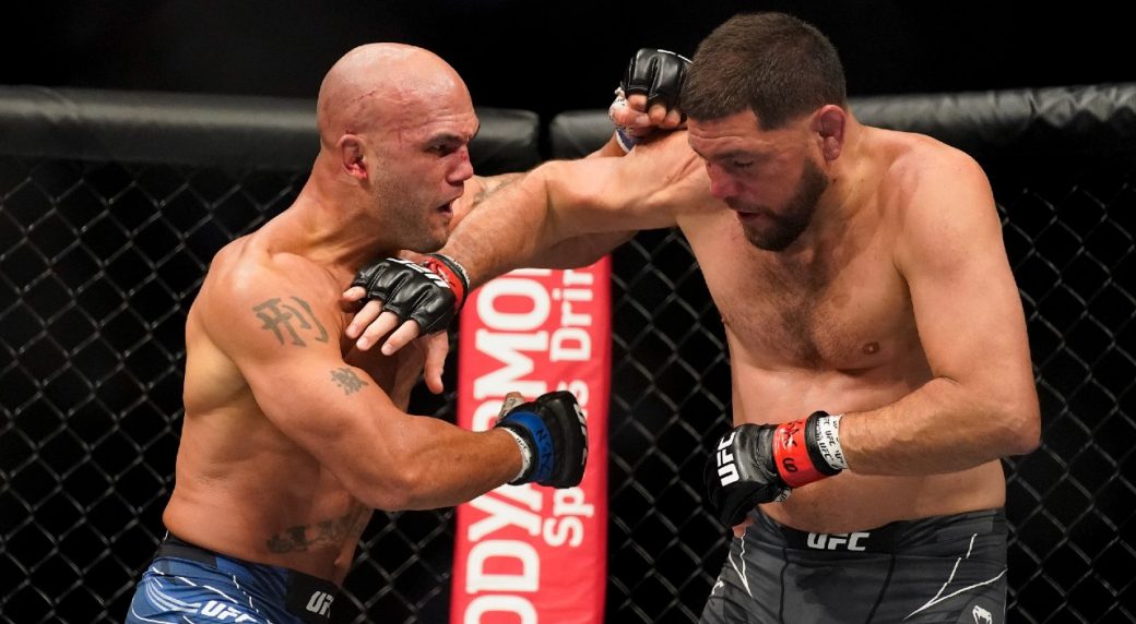 Diaz rolled onto his back when Lawler hit him again with a left hand, but Lawler declined to go to the ground with Diaz, instead gesturing at him to get up. The referee then spoke to Diaz, who indicated he wouldn’t or couldn’t go on 44 seconds into the third round.
