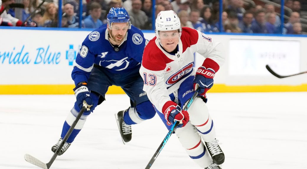 Montréal Canadiens right wing Cole Caufield (13) beats Tampa Bay Lightning center Zemgus Girgensons (28) up the ice during the first period of an NHL hockey game Sunday, Dec. 28, 2025, in Tampa, Fla. (Chris O'Meara/AP)