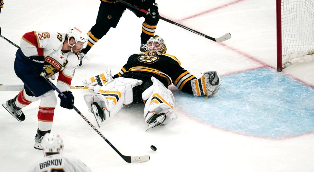 Boston Bruins goaltender Linus Ullmark drops to the ice as Florida Panthers left wing Matthew Tkachuk (19) skates past while scoring the game-winning goal during overtime of Game 5 in the first round of the NHL hockey playoffs, Wednesday, April 26, 2023, in Boston. (Charles Krupa/AP)
