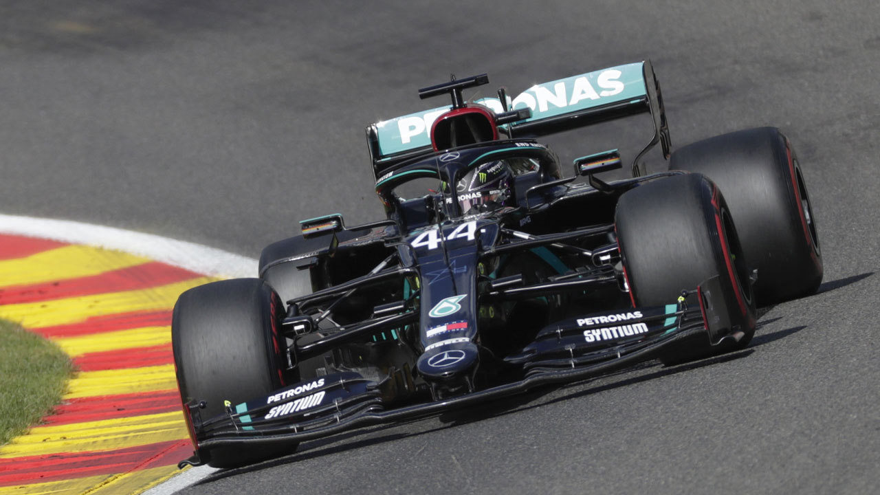 Mercedes driver Lewis Hamilton steers his car during a practice session for the 2020 Belgian Grand Prix. (Stephanie Lecocq,/AP)