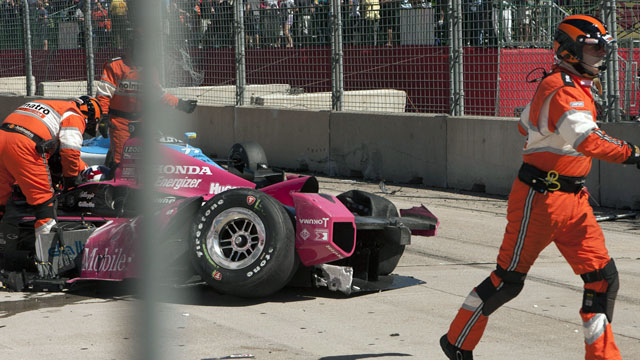 The accident occurred when Franchitti ran into the back of Takuma Sato’s car and launched over it and into the fence. Sato appeared to have a problem with his car and was limping toward the finish when Franchitti came up quickly behind him in Turn 5.
