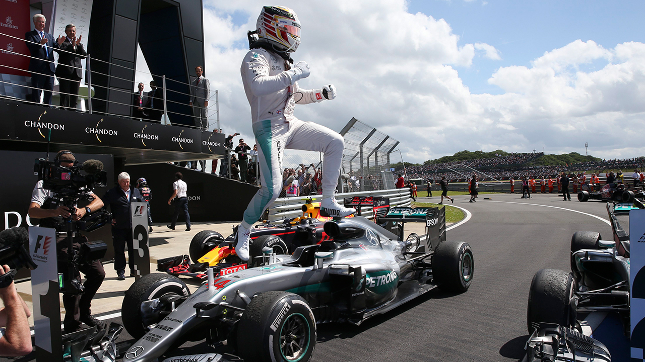 SILVERSTONE, England — Defending champion Lewis Hamilton reeled off his fourth win in five races Sunday to storm to victory in the British Grand Prix and trail Nico Rosberg by one point.