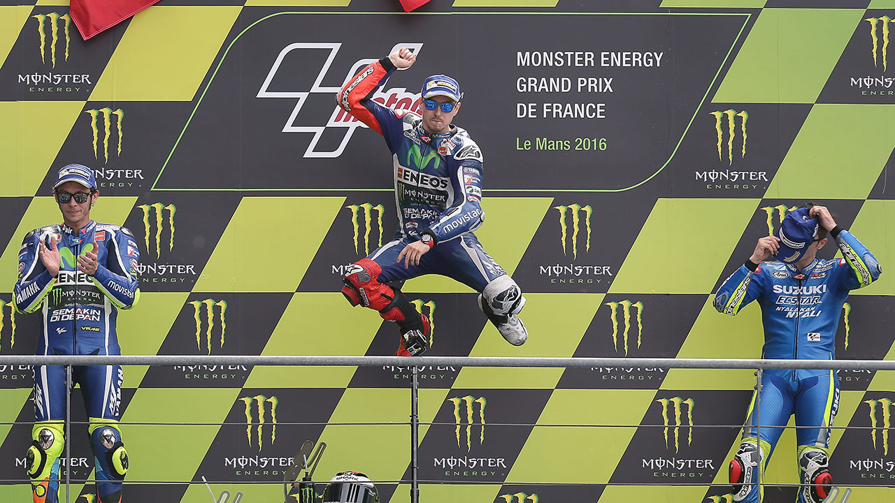Lorenzo, who set a new fastest lap record on the 4.2-kilometre (2.6-mile) Le Mans circuit in qualifying, was in total control and won ahead of Yamaha teammate Valentino Rossi. Maverick Vinales completed the podium on his Suzuki.