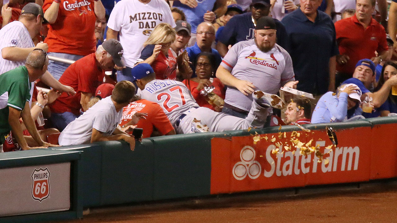 Russell hit a three-run double in the first inning, then made a food run for a fan in enemy territory while the Cubs beat the St. Louis Cardinals 10-2. Chicago can wrap up the division with a win Tuesday against the Cardinals or a loss by Milwaukee against Cincinnati.