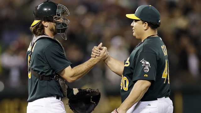 OAKLAND, Calif. — Bartolo Colon watched Alex Rios’ foul pop fall into first baseman Brandon Moss’ mitt, looked back at his catcher and started the ceremonial high-five line that follows most victories.