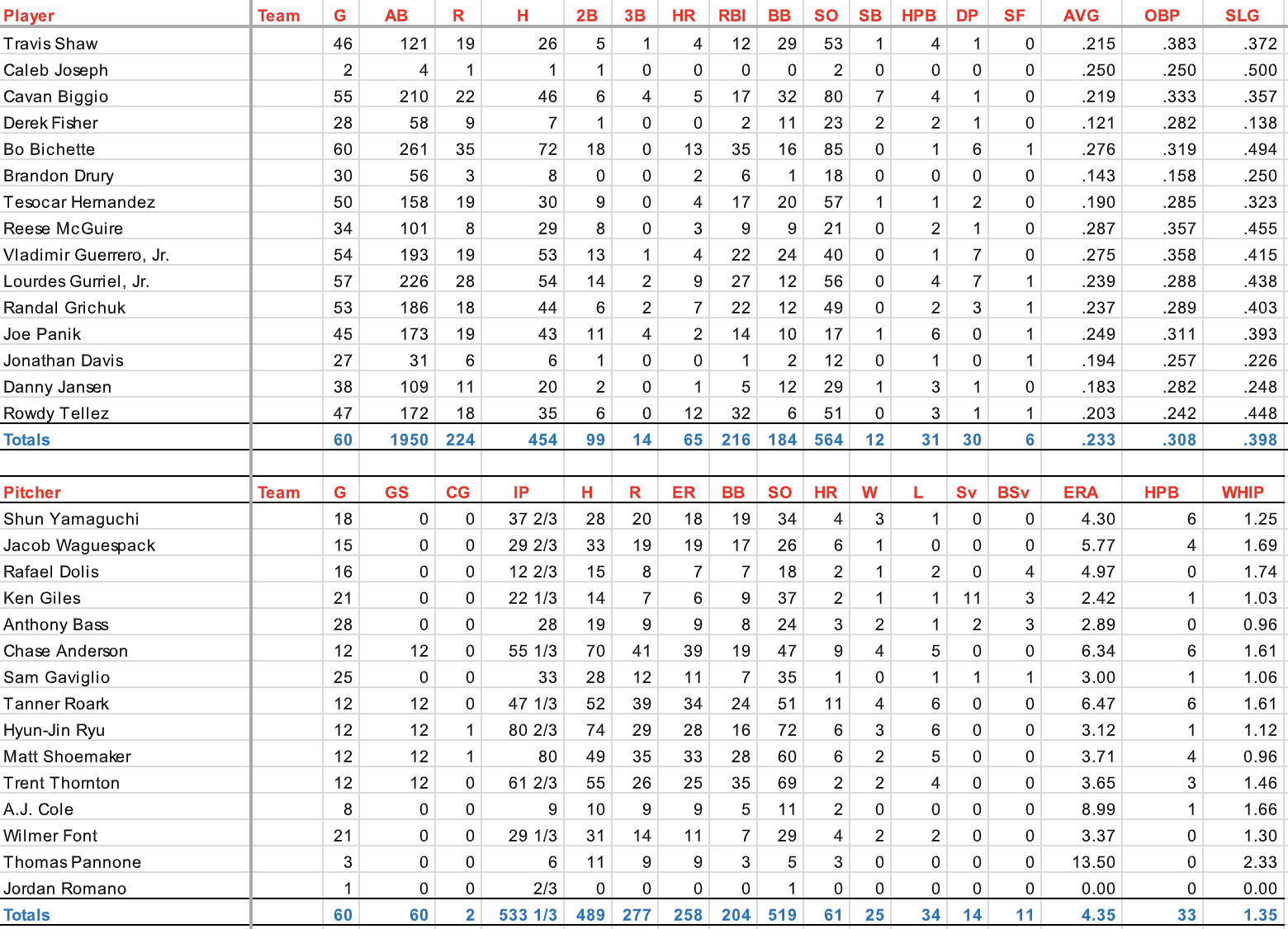 The simulation has been cruel so far, to be sure, with only Joe Panik and Travis Shaw outperforming their 2019 OPS and with several others, including Hernandez (.170), Gurriel (.143), Bichette (.117), Jansen (.110) and Biggio (.103) posting an OPS more than 100 points below what they put together in 2019. It’s fair to say that in real life, we expected all but Bichette to be better this season, and that’s only because Bichette set his bar so high.