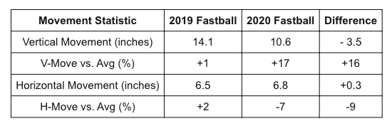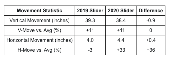 As far as his slider is concerned, this is where it’s important to understand what “movement vs. average” really measures. While Romano has put up similar movement numbers to his 2019 season, they mean something very different.