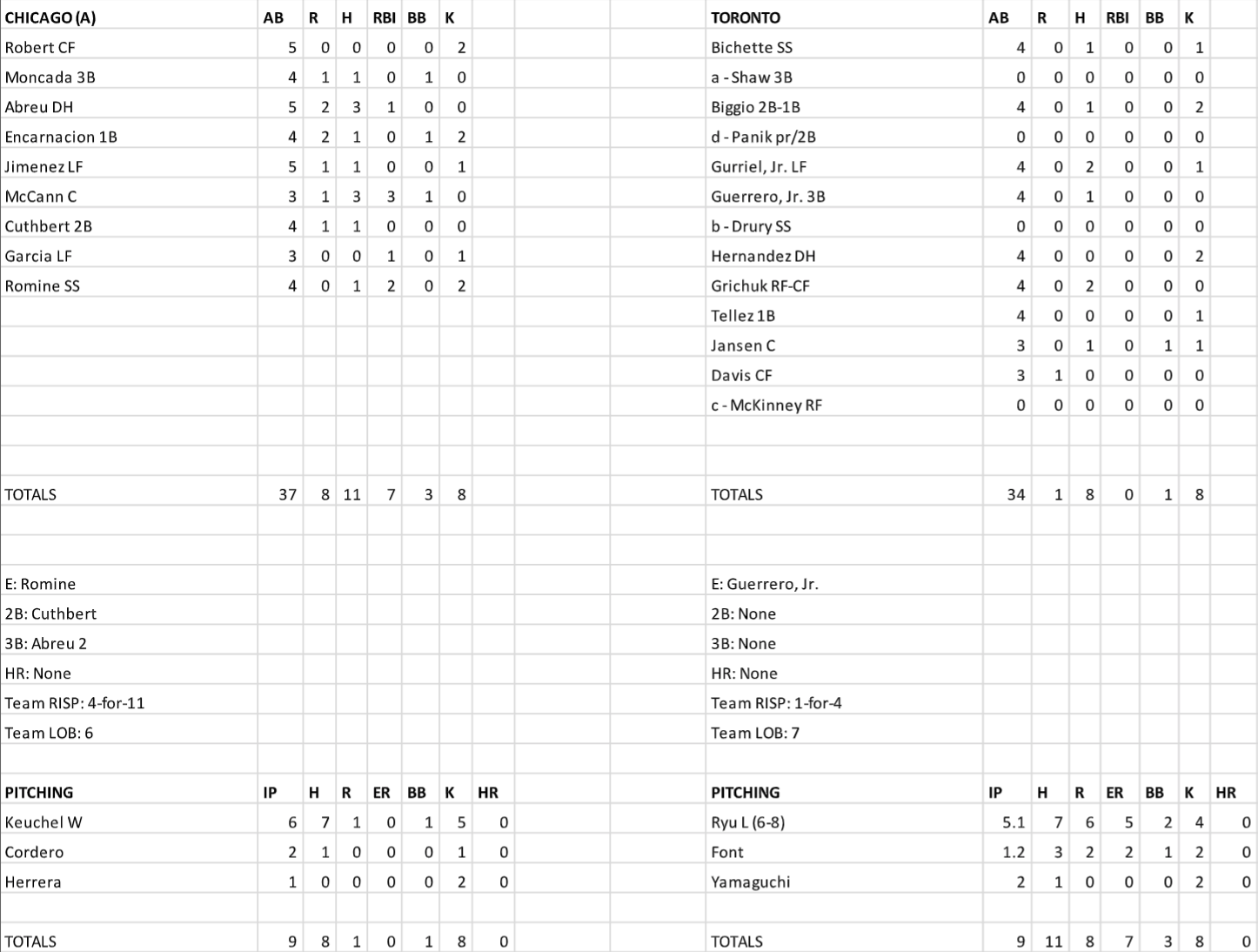 The Jays actually struck first in the game. With two on and two out in the third, Lourdes Gurriel Jr. hit a weak ground ball to short that Andrew Romine (subbing for injured 2019 A.L. batting champ Tim Anderson) threw away, allowing a run to score.