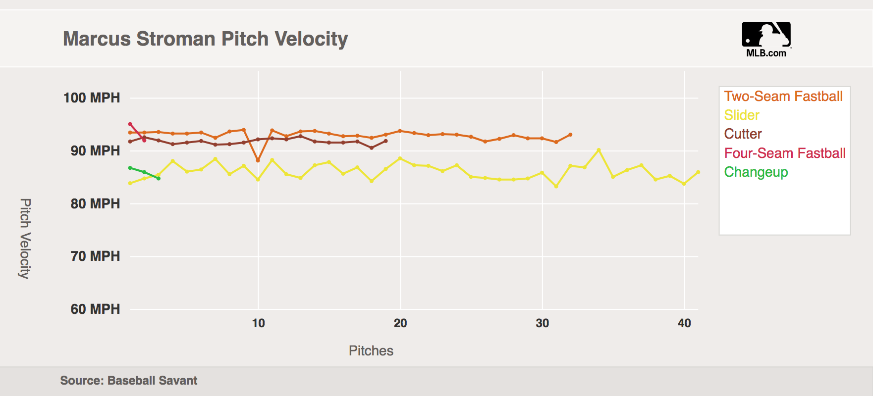 Stroman clearly has a strong feel for the pitch at the moment, as he’s been throwing it both inside the zone for strikes and off the plate for swing-and-miss. But he’s been making it even tougher for hitters to track by adding and subtracting from its velocity. Friday, he threw it as softly as 83 m.p.h. and as firmly as 90 m.p.h.