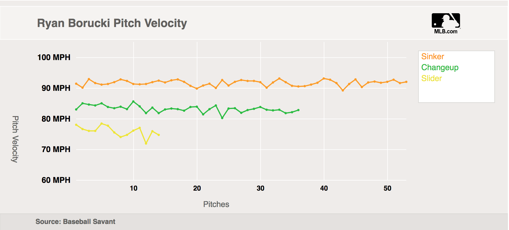 Sunday, Borucki had some of his best stuff yet, earning 15 swinging strikes, including 11 with his change-up. He threw 60 per cent of his pitches for strikes in all, and showed an intriguing ability to add and subtract with his sinker, fluctuating its velocity from as low as 89 m.p.h. and up to 93 throughout his outing.