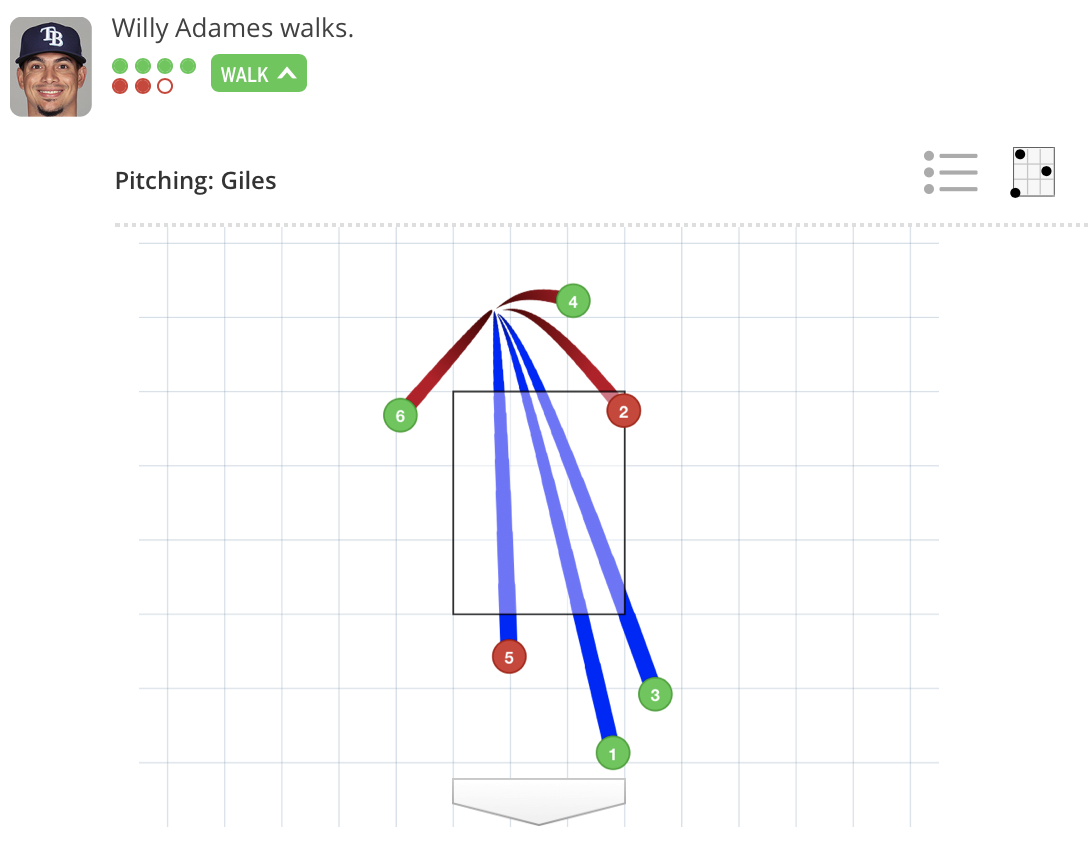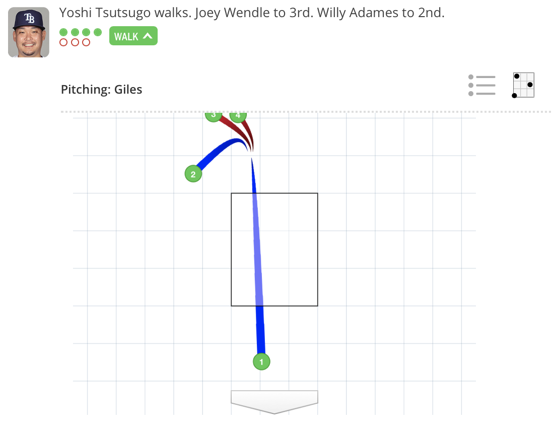 Next came a four-pitch walk to Yoshi Tsutsugo that was even more erratic, with Giles looking increasingly uncomfortable in his mechanics, laying in sliders and max-efforting his way through messy fastballs.