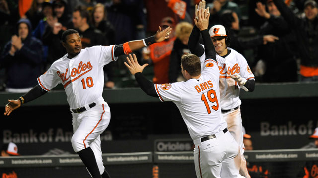After a J.J. Hardy sacrifice bunt, Steve Pearce popped out to second, Nolan Reimold was intentionally walked and Alexi Casilla’s weak chopper to short seemed to be the end of the inning. But Kawasaki never seemed to get set right, bounced a throw that Encarnacion couldn’t scoop, and four pitches later Markakis slashed a low and away fastball to left to win the game.
