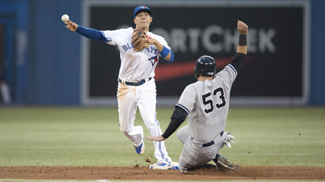 In Monday’s 5-2 win over the Yankees, for instance, he took a feed from third baseman Brett Lawrie at second, and with a runner bearing down on him and fired a laser to first base to complete a 5-4-3.