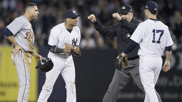 The Tigers scored twice in the eighth after second base umpire Jeff Nelson missed a call on a two-out tag at second base. Yankees manager Joe Girardi argued, and was ejected on his 48th birthday.