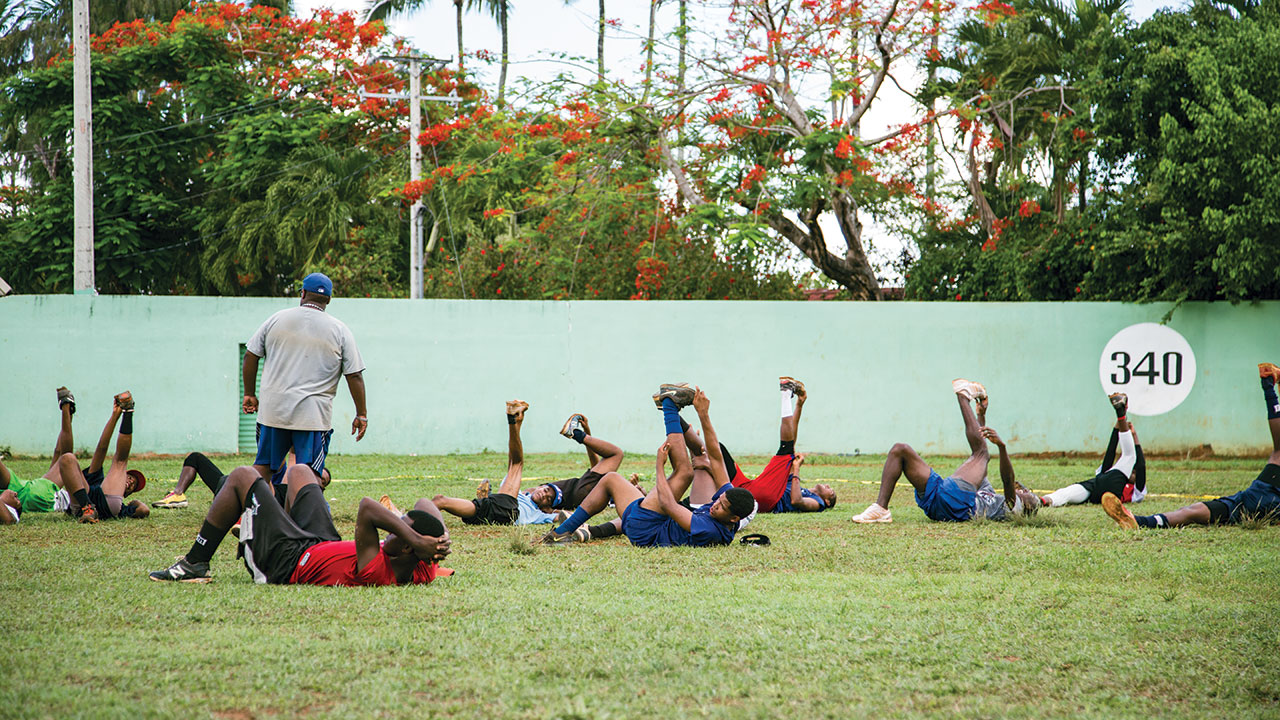 You’ll see this brotherhood, where eight-year-olds are practising with 16-year-olds. They don’t have batting cages, they don’t have workout machines or anything close to that. The pitchers get into their windup and delivery whipping a branch—just a foot-tall weed they pick out of the outfield. They use that to help continue the momentum. There’s a half-submerged tire in the ground, and they take a bat that’s wrapped in cloth and electrical tape to weigh it down, and they just beat on the tire—they’re strength training. In the outfield, under the blistering sun, they had one guy holding up a twig, and another guy swinging a bat and clipping the top of that branch over and over, practising precision.