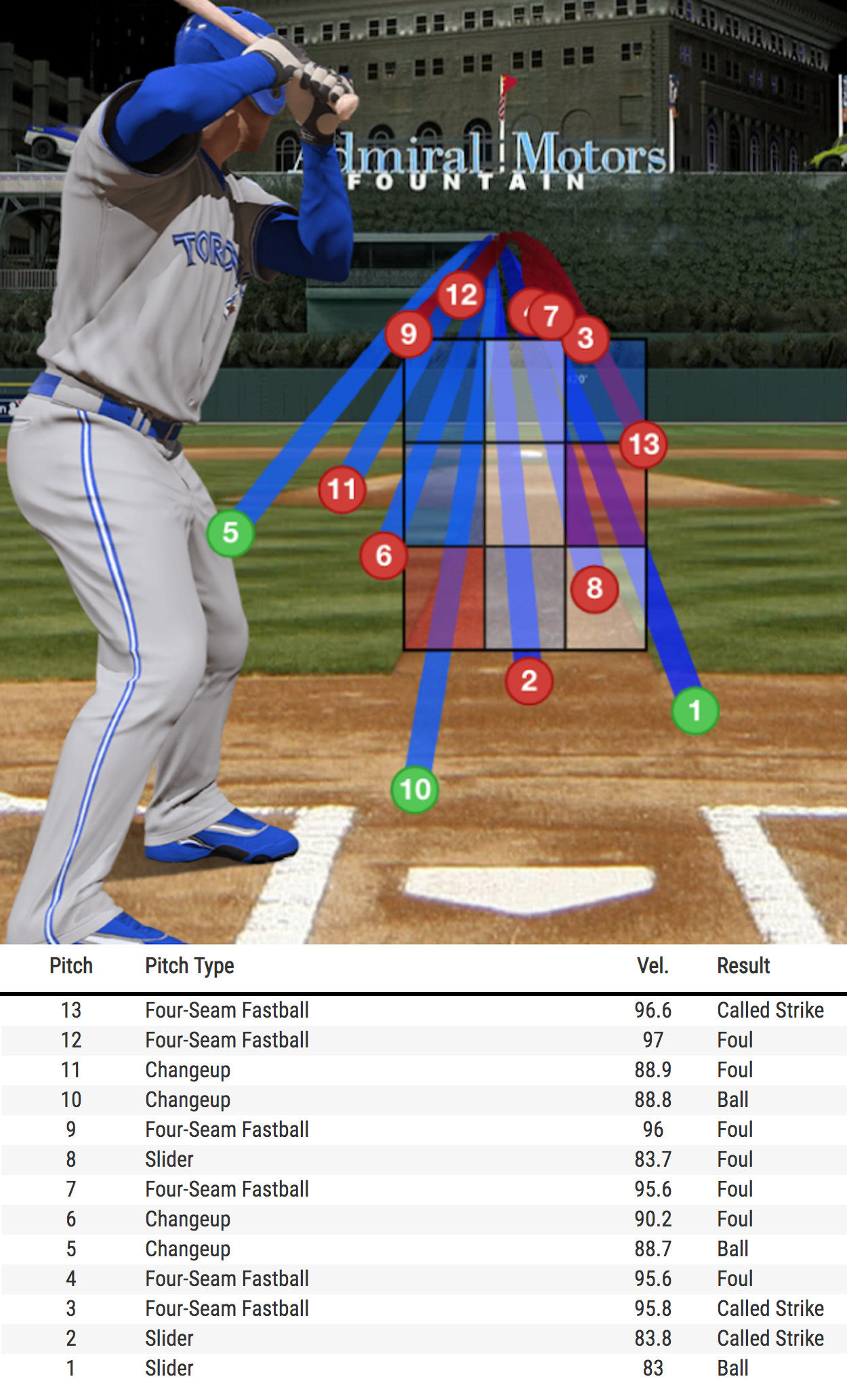 Two innings later, with the Blue Jays now up by two after Brandon Drury’s go-ahead shot, Guerrero made his fourth trip and contributed this absolutely bonkers plate appearance: