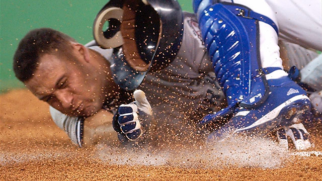 “The throw was from (Carlos) Delgado and it was a little bit behind me, toward home plate, so as I was running full speed, I had to reach back behind me to catch the ball, and I was running, my whole game-plan was to catch it, slide on my knees in front of the base and then hope he would slide into me trying to get to the base. But we happened to get there at the same time.