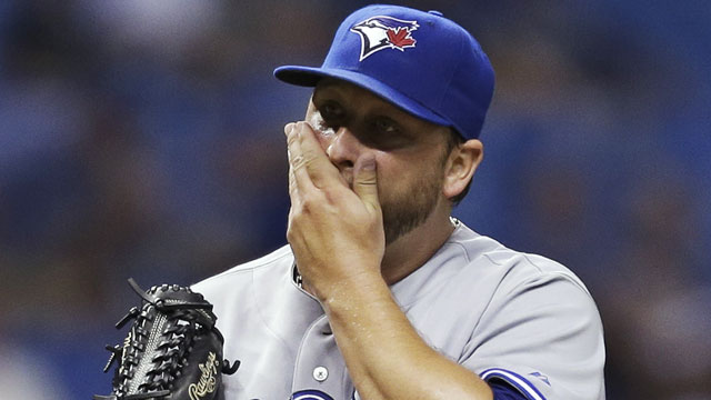 The left-hander wasn’t as fortunate in the fourth, as with the bases loaded, Rays left-fielder Sean Rodriguez hit a fly ball to right that Bautista caught and fired home to try and get the tagging Jose Molina. While the throw beat the lead-footed catcher, Molina somehow avoided J.P. Arencibia’s tag to earn the safe call, and rather than a game-saving defensive play, the two other runners advanced and scored on a Ben Zobrist sac fly and Wil Myers base hit.