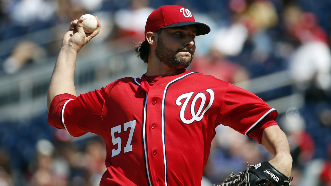 Washington Nationals starting pitcher Tanner Roark throws during the eighth inning of a baseball game against the San Diego Padres at Nationals Park Saturday, April 26, 2014, in Washington. Roark pitched a complete game shutout. The Nationals won 4-0. (AP Photo/Alex Brandon)