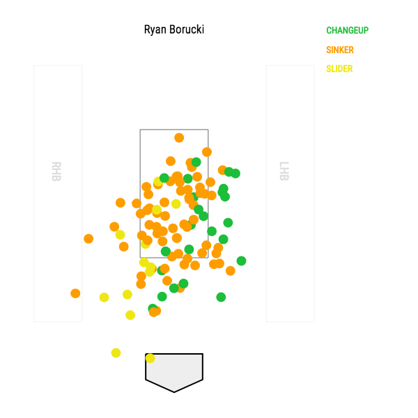 Like most effective pitchers, Borucki’s game is predicated on command and attacking the edges of the plate. And he has to be happy with how his pitch chart looked at the end of the outing:
