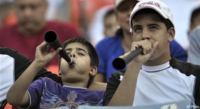The horns given out Saturday were about half the size as the vuvuzelas that provide the constant — some say annoying — buzz from the stands at World Cup matches. Nonetheless, they packed such a noisy punch for the Marlins and Rays that players and umpires quickly popped in earplugs, and conversations even in the dugouts were nearly impossible.
