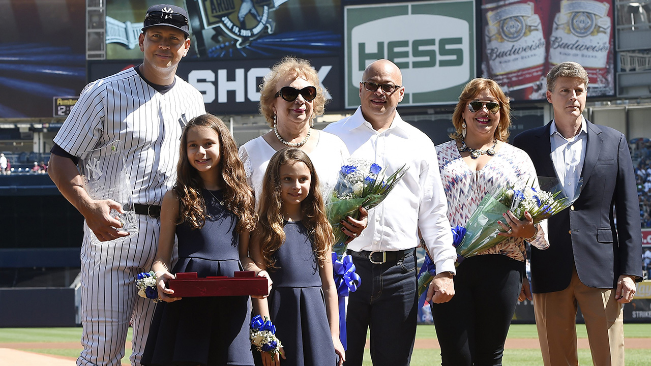 His mother, brother, sister and his two daughters, joined Rodriguez on the field for the seven-minute ceremony. Rodriguez did not speak.