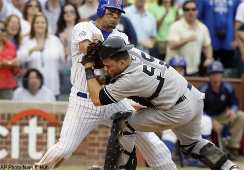 Errors on shortstop Eduardo Nunez and second baseman Robinson Cano helped Chicago load the bases with one out in the bottom of the sixth. Geovany Soto then hit a sinking liner to left off Cory Wade, but Gardner tracked it down and made a strong one-hop throw to catcher Russell Martin of Chelsea, Que., who held on for the final out after Carlos Pena slammed into him.