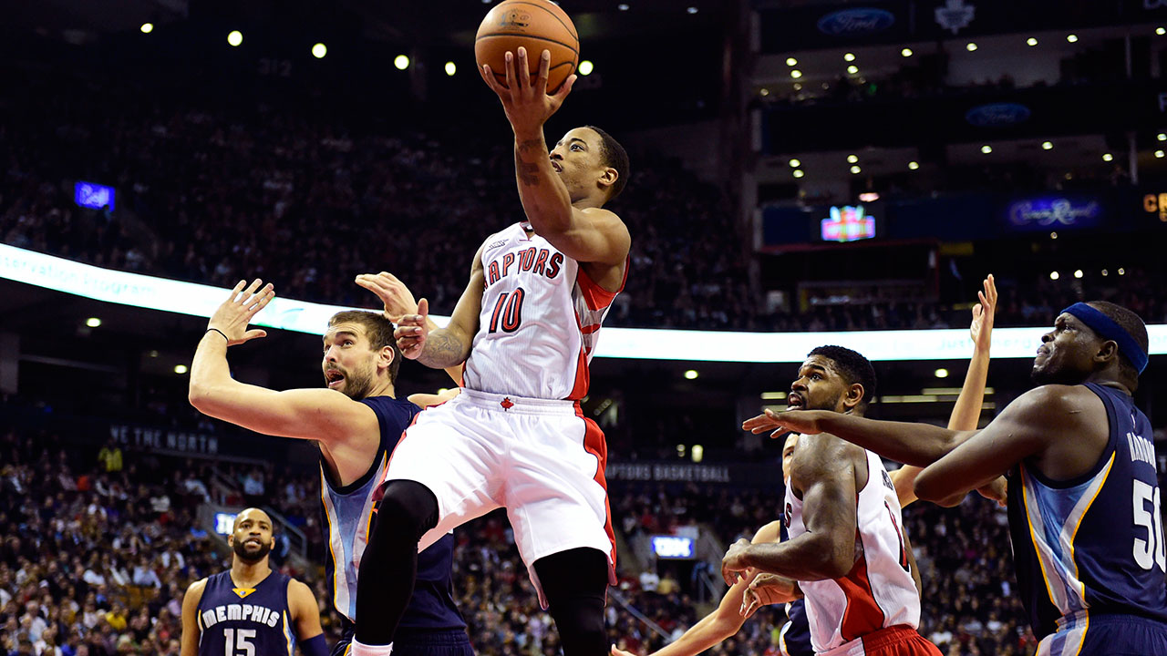 DeMar DeRozan poured in 21 points and Terrence Ross scored 14 of his 16 points in the fourth quarter as the Raptors beat the depleted Grizzlies 96-92 on Wednesday, to maintain their first place spot in the Eastern Conference.