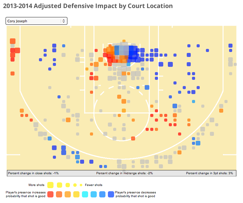 The chart shows Joseph excels at defending the three-point line (aside from the left corner) and is also surprisingly stout inside the arc, possibly thanks to his excellent size for his position.