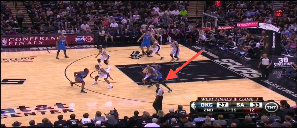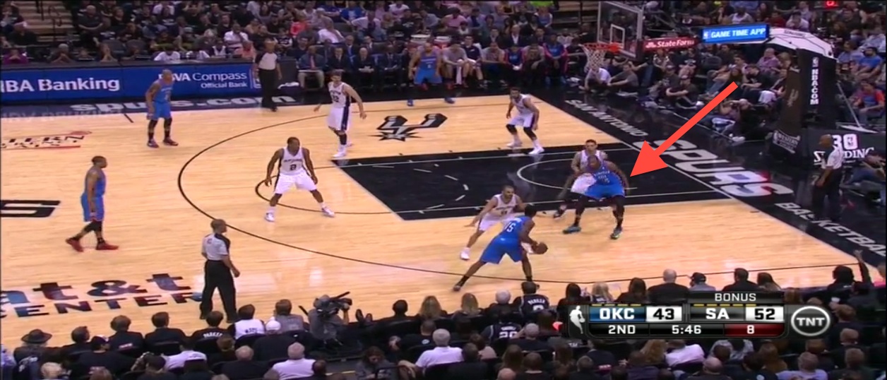 The loss of Ibaka’s offence, as well as his ability to protect the paint without having to foul (the Spurs’ free-throw attempt rate soared from 20.0 percent to 29.2 when he headed to the bench) drastically transforms the Thunder on both sides of the ball. And a major symptom of that transformation is an intensifying of the already blinding spotlight on Kevin Durant’s performance in the series.