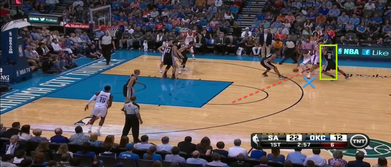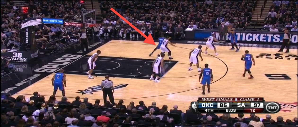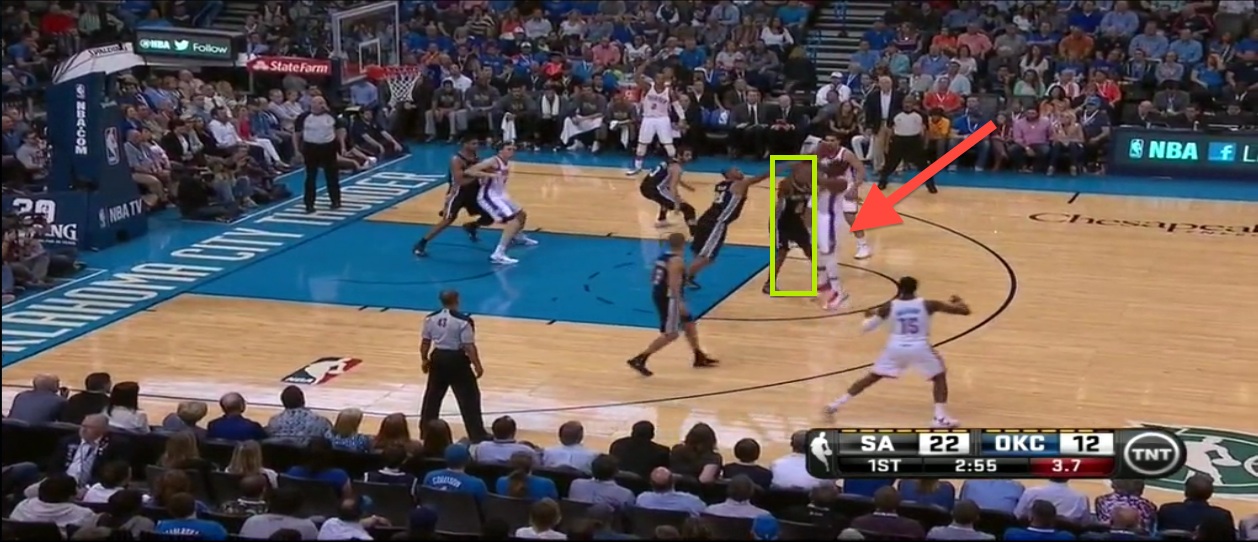 Leonard’s PnR coverage is perfectly complemented by Tiago Splitter, who flanks him in San Antonio’s setup and excels at stifling the roll man, part of a Spurs’ system that encourages defenders to hedge hard on screens and then quickly retreat. Splitter found himself on an island on defence at times in Game 1, hurriedly searching for an opponent due to the cross-matching caused by OKC’s quirky five-man lineups, but a few split-seconds of indecision won’t be enough to cause real alarm in the Spurs’ camp.