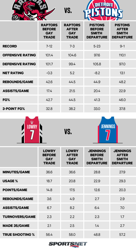 The first table below compares this season’s Pistons (before and after Smith’s departure) with last year’s Raptors (before Gay was traded and the 10 games after the trade) on a broader level. The second looks at the individual performances of Brandon Jennings—who has appeared to benefit the most with Smith no longer in Detroit—and Kyle Lowry, who also saw his production take an immediate leap following the Gay trade.