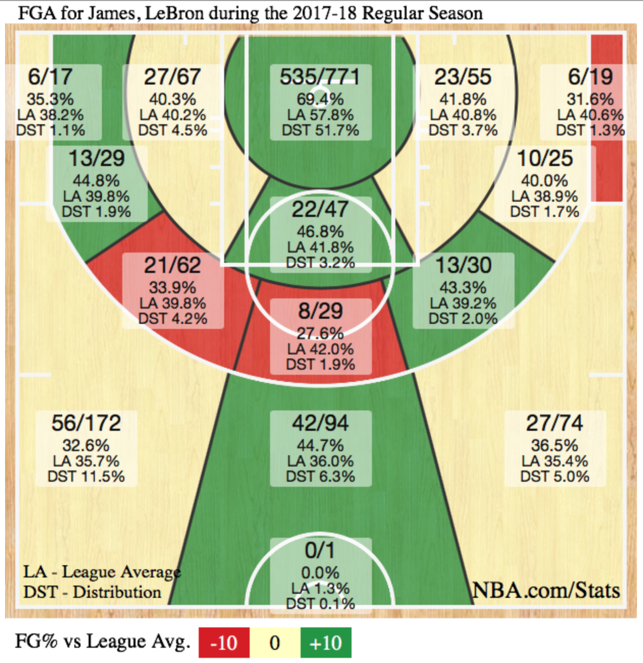 There was once a time when you could try to contain James on the perimeter and force him to take jumpers. But as his game has evolved over the years — we’re into season 15 and his game has never been more complete — that’s no longer an option. This season, James is hitting a respectable 37 per cent of his three-point attempts and has been effective in the mid-range as well. (Shot chart via NBA.com)