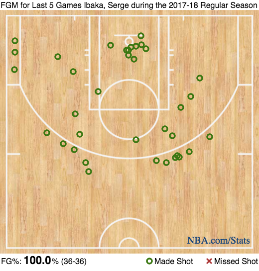 What immediately stands out is the lush green all around the perimeter. Ibaka has been incredibly aggressive with his three-point shot this season, (often a beneficiary of drive-and-kicks and the team’s new emphasis on swinging the ball), averaging a career-high 4.6 attempts per game. Over the course of this season, his 38.1 three-point field goal percentage is down from 39.1 per cent last season. During his first 18 games he shot just 32.5 per cent from deep.