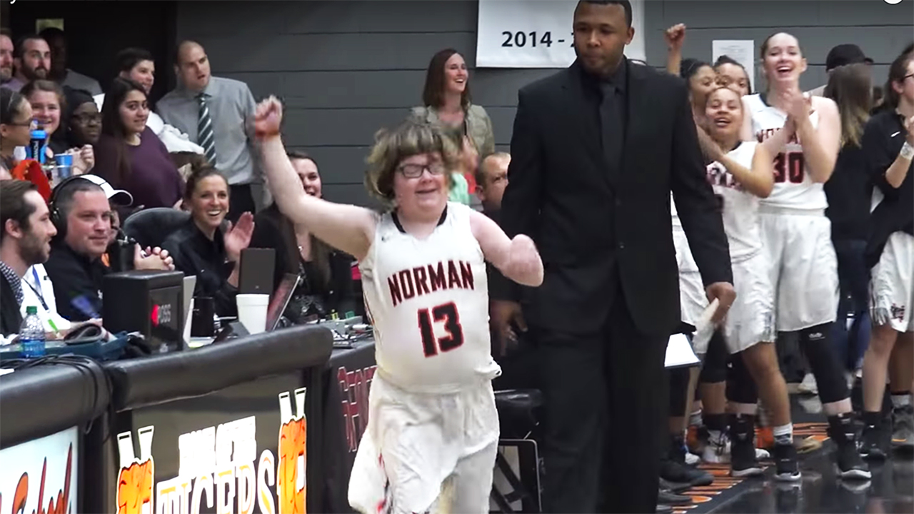 Norman High School senior Lainy Fredrickson brought the house down at a school basketball game when she scored the final basket in a win over rival Norman North.