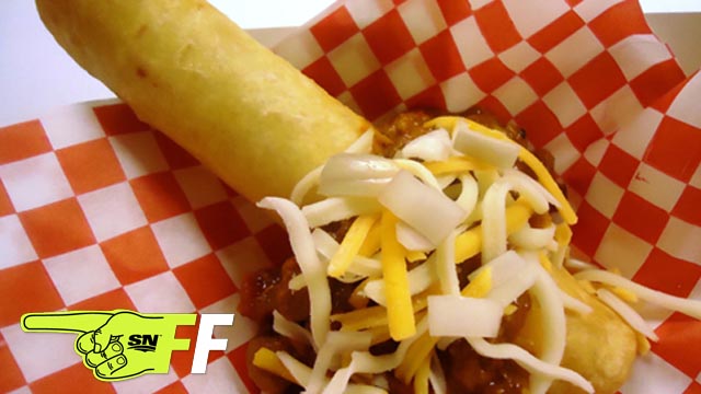 When you head out west to California, nothing hits the spot at Angel Stadium like a Cali Dog. Unique to Angel Stadium, it is a hot dog wrapped in a flour tortilla then deep fried and topped with chili, cheese and diced onions.