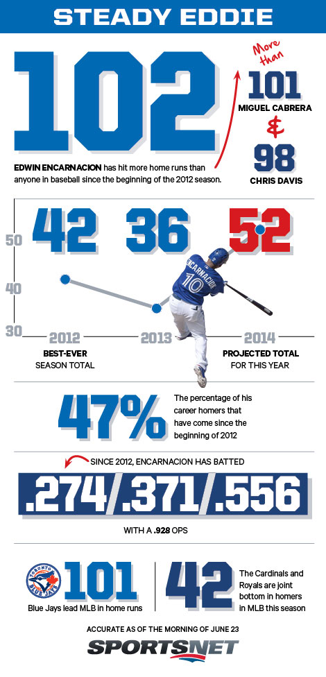Sure, Edwin Encarnacion hit 16 homers in May and tied Mickey Mantle’s long-standing record for dingers in the month. That’s great stuff—but May is over. Thankfully, Double-E’s May performance is just a concentrated version of what he’s been doing for years now. In fact, since the beginning 2012 no one in baseball has hit more homers than Encarnacion. That’s long-term plate power, and the Jays are reaping the benefits.