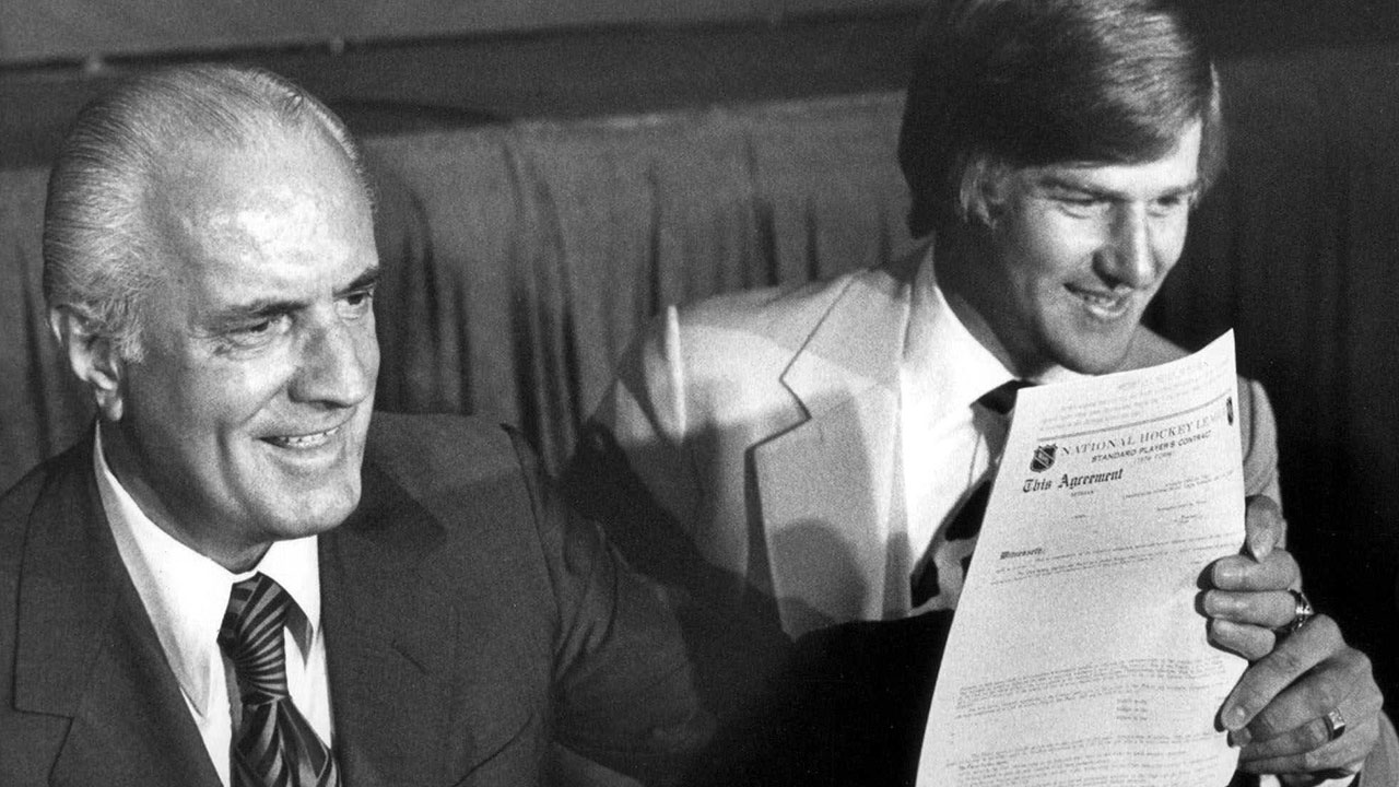 Bobby Orr holds a multi-million dollar contract with the Chicago Blackhawks at signing ceremony with general manager Tommy Ivan in 1976. (AP Photo)